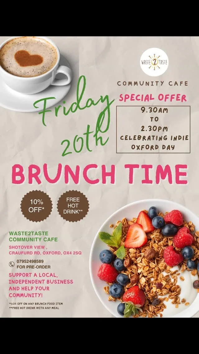 Our cafe is a warm & welcoming space in East Oxford, with free parking and a delicious menu, all made using surplus ingredients. Learn more >